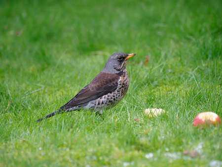 Fieldfare Turdus pilaris sitting on grass in early spring looking for food.