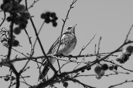 Adult fieldfare perches on branch of crabapple tree in bright sunlight. Usually seen on farmland, the birds come to domestic gardens looking for food - monochrome processing