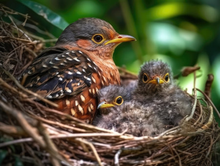 A heartwarming scene of a parent bird feeding its chicks in a well-crafted nest, surrounded by lush greenery, highlighting the nurturing bond in nature.