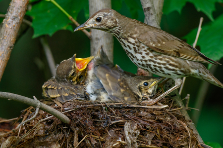 The thrush-throat nest. Open-beaked yellow chicks are waiting for parents with food