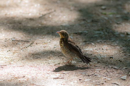 A thrush chick fell out of the nest. A small bird is sitting on the ground.