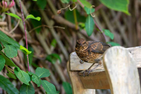Juvenile blackbird, turdus merula, perched on a garden wooden fence