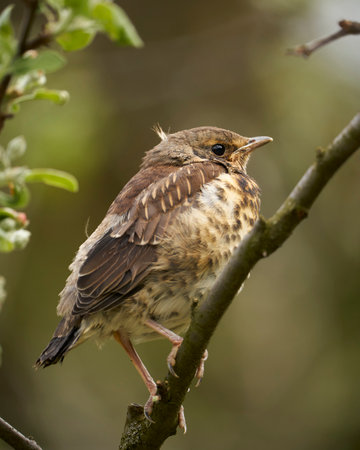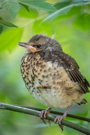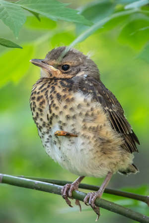 A fieldfare chick, Turdus pilaris, has left the nest and is sitting on a branch. A chick of fieldfare sitting and waiting for a parent on a branch. Wildlife scene from spring forest.