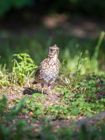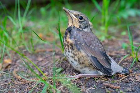A fieldfare chick, Turdus pilaris, has left the nest and sitting on the spring lawn. A fieldfare chick sits on the ground and waits for food from its parents. Wildlife scene from spring forest.
