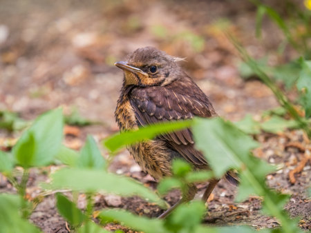 Portrait of nestling fieldfare (Turdus pilaris). Small bird in environment.