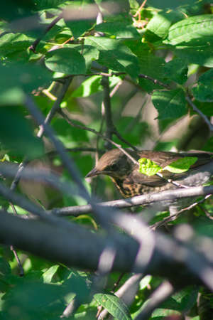 Song thrush (Turdus philomelos) while searching for prey in the bushes in the morning