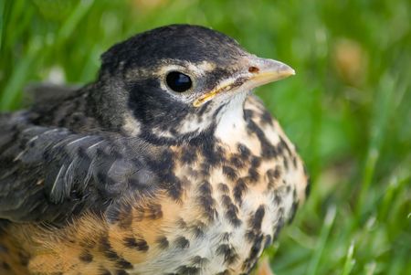 Young thrush on green grass.