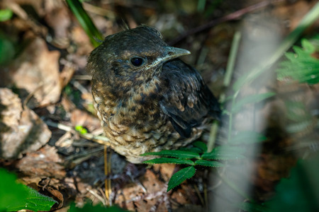 Young blackbird on the soil in the garden