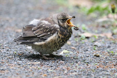 Feeding the nestling thrush fieldfare with a worm in the natural environment