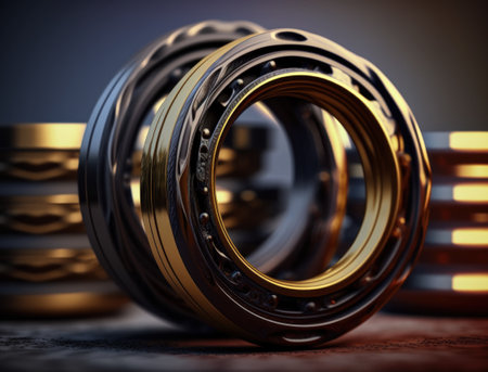 Intricate bearings rest on a reflective surface, aglow with soft city lights.