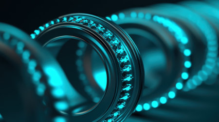 This image showcases a series of precision-engineered bearings with a striking blue glow against a dark background. The close-up detail highlights the intricate design and quality of this essential machinery component.