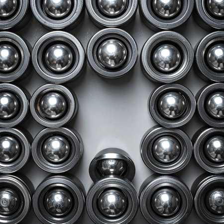 This image features an intricate close-up view of precision metal bearings, showcasing their smooth surfaces and cylindrical design, perfect for industrial applications.