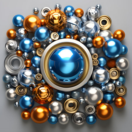 Pile of shiny metal ball bearings in varying gold and silver tones, representing precision engineering, industry, manufacturing, and high tech mechanical components