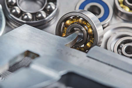 vernier caliper measures bearings against a metal background. Part of the mechanism.