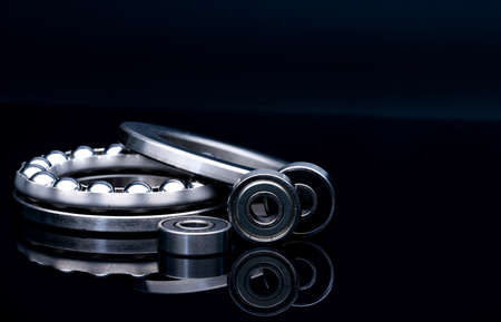 Group of various ball bearings and gears close up on nice blue background with reflections.
