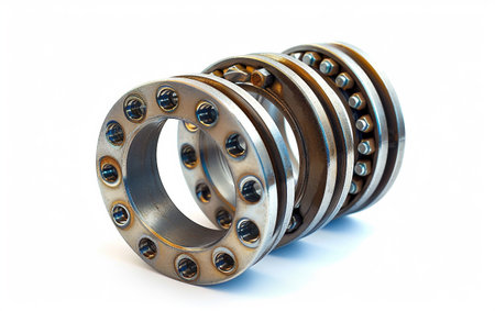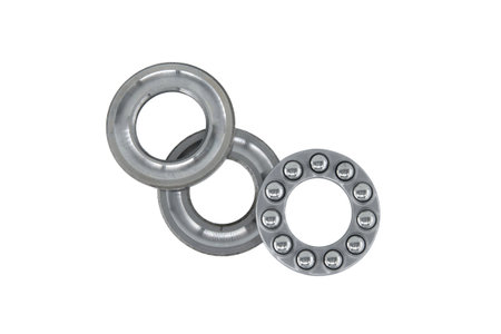 Thrust ball bearing isolated on white background, bearing are stacked upon each other, showcasing the inner structure