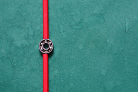 One ball bearing between two red pencils on green background