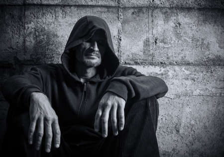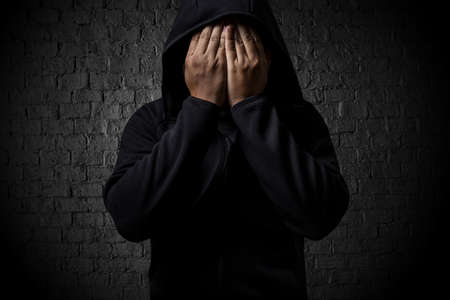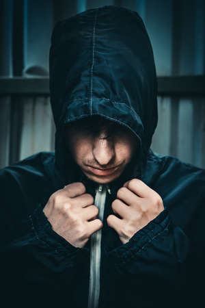 Hooded criminal in dark. Mystery man with hood. Gangster in urban street. Hooligan in hoodie. Stalker with hidden face. Unknown suspicious thief, burglar, hacker or terrorist with grunge background.