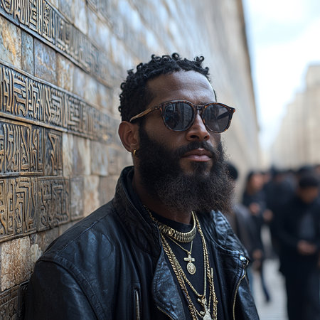 Portrait of a fashionable man with a beard, sunglasses, and jewelry leaning against a textured wall in an urban setting, expressing individuality and contemporary style.