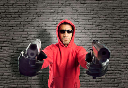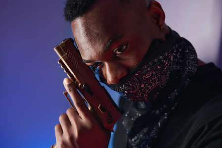 A man in a mask holds a gun in his hand, wearing a hooded jacket over his head, looks at the camera, isolated