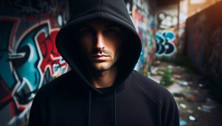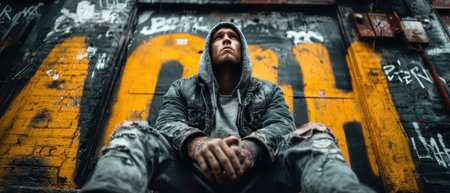 A man in a hoodie sits pensively in front of a vibrant graffiti wall in an urban setting surrounded by rich textures and colors.
