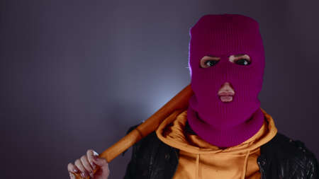 Young woman in pink balaclava with baseball bat. Hooligan in mask with bat in hands.