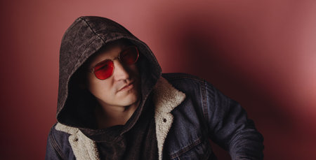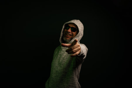 Portrait of man wearing sunglasses and hooded sweatshirt standing, motionless, making hand gestures. Isolated on dark background.