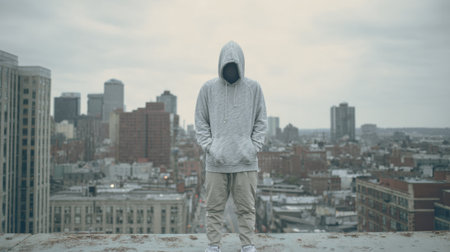 A person wearing a gray hoodie stands on a rooftop, facing away from the city skyline under a cloudy sky. The urban landscape features tall buildings and distant skyscrapers.