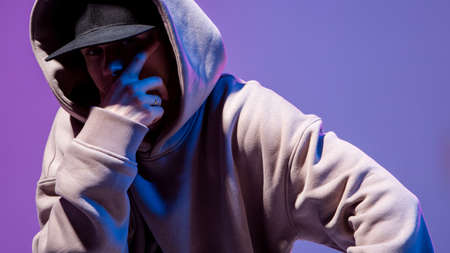 Men portrait in a neon light. Beneath in the hoodie and hat. Dark face. Hip-hop style.