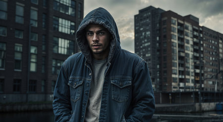 Suspicious Caucasian Men in his 30s Wearing Black Hoodie and Tactical Gloves.
