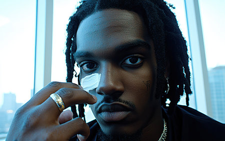 A young man applies a skincare product while gazing thoughtfully. The scene captures a moment of self-care within a bright urban environment.