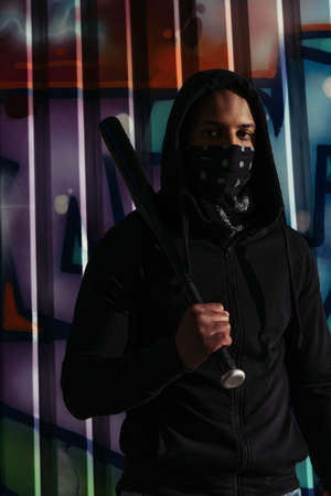 African american hooligan holding baseball bat and looking at camera near graffiti on urban street