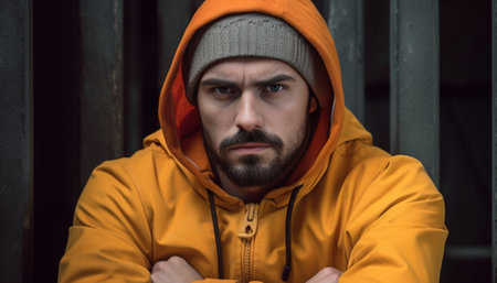 Serious handsome bearded European guy looks directly at camera has thick bristle wears purple hoodie dressed in casual hoodie poses over yellow background listens informa : Generative AI
