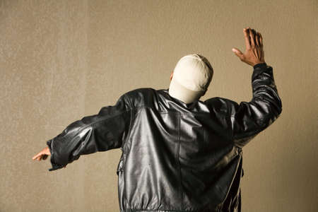 African young man in furcoat bowing with his hands put together in front of face while standing by bars in hideouts