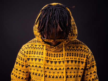 Portrait African man with dreadlocks in black t-shirt standing near city wall