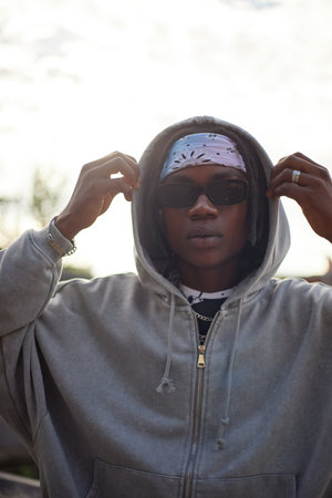 Portrait of young Black man wearing sunglasses and hoodie adjusting hood outdoors, standing with confident expression, visible jewelry and accessories, looking directly at camera