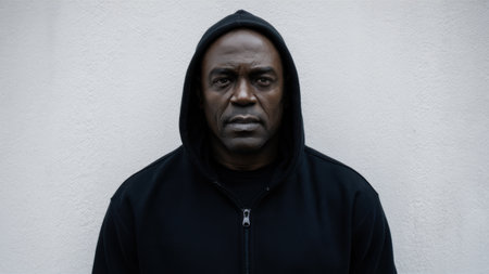African American man in gray hoodie leans against a rough wall, showing visible distress and emotional turmoil, representing the challenges of drug addiction and mental health struggles
