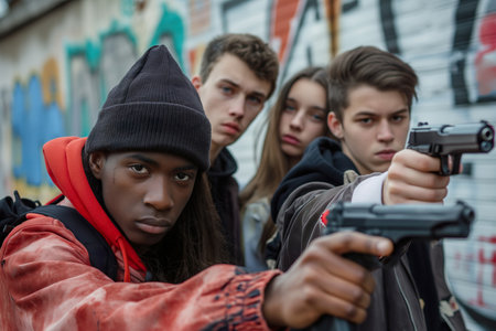Teenagers standing defiantly, holding guns in front of a graffiti-covered wall in the city.