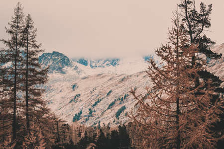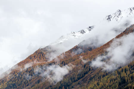 Foggy autumn or fall alpine mountain slopes with orange colored larch trees. Peaceful traveling, nature and countryside beauty concept scene