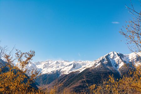 Mountain landscape with snow capped peaks at sunset. Caucasus, Russia