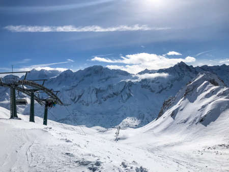 Chairlift in Passo del Tonale with Presena glacier in background.