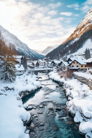 cold river at austrian town in snowy mountains