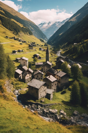 Beautiful mountain valley with stream, trees, puffy clouds and blue sky, Livingo village in background, Italy, Alps