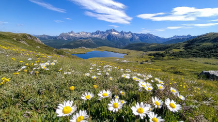 A scenic mountain view with wildflowers in foreground and serene lake