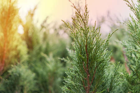 Thuja evergreen coniferous plant outdoors. Hot sunny summer day. Selective focus. Close-up