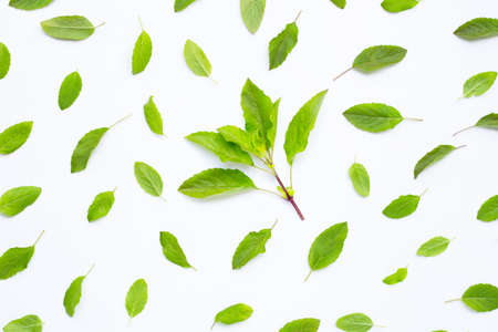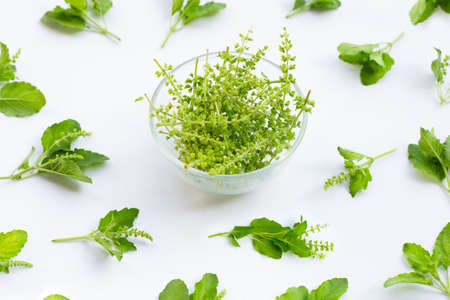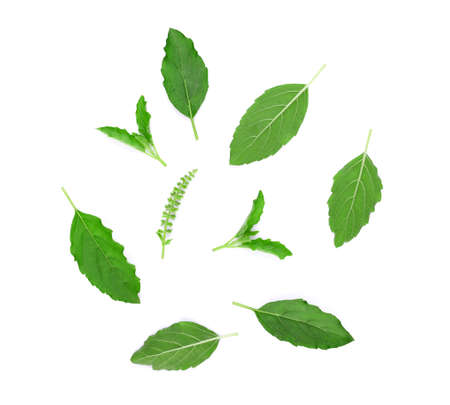 Fresh holy basil leaves on white background.
