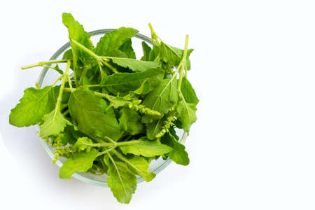 Holy basil leaves with flower in bamboo basket on white background.