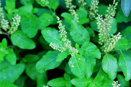 Green basil with flower and seed in plant, Thai herbs and spices