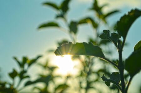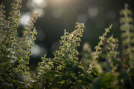 Organic Holy Basil or Tulasi with flowers in a greenhouse at sunrise. Close-up tree