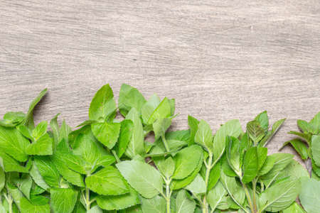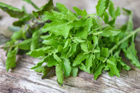 Holy basil leaf nature vegetable garden on wooden table kitchen herb and food - Ocimum sanctum , green sweet basil in thailand